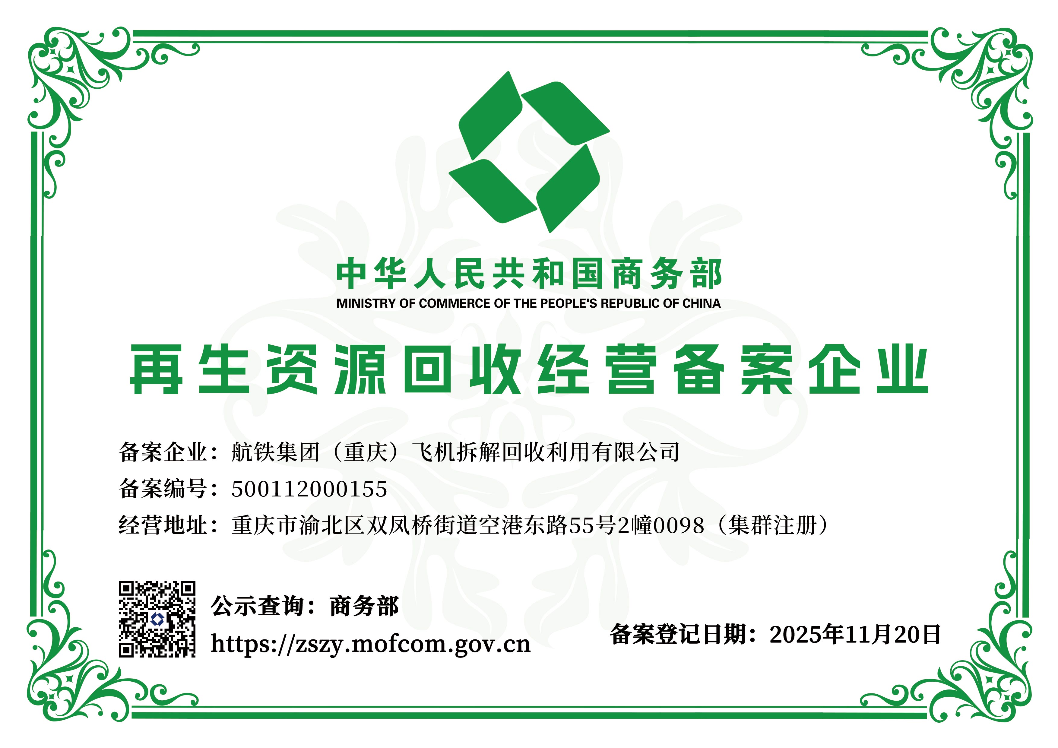 喜报!航铁集团(重庆)飞机拆解回收利用有限公司)获商务部再生资源回收经营许可证